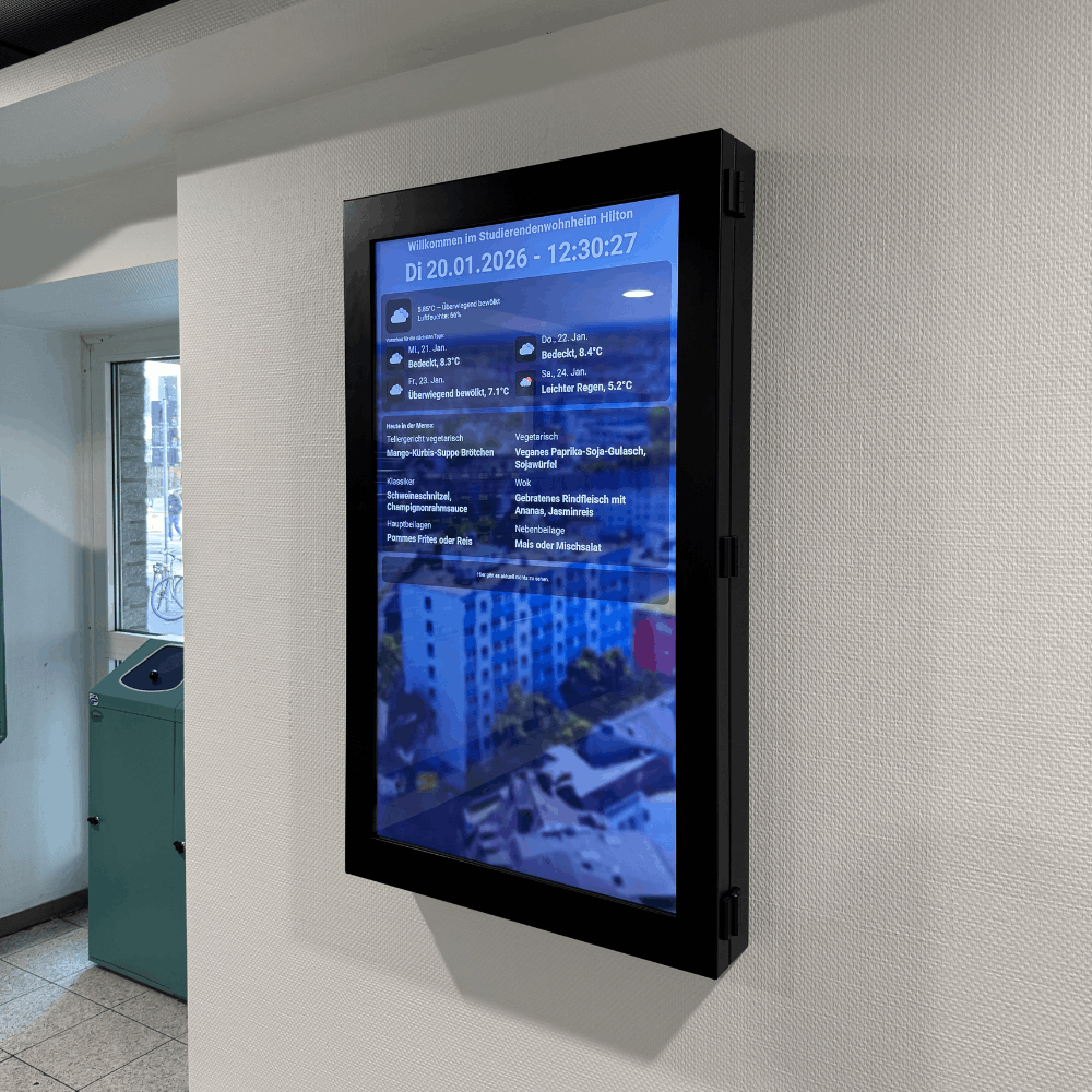 Der integrierte Monitor (Standard-Ausführung) ist mit einem Mediaplayer ausgestattet (Android, iiSignage, FailOver, EShare) und ermöglicht die flexible Inhaltswiedergabe via WLAN, USB-Stick oder optional über eine Content-Management-Software.